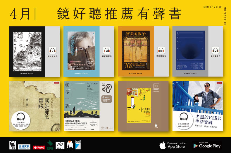 本月推薦的好書,除了主播的詮釋精湛,有些在音效、角色調度等安排也下了不少功夫。閱讀,是因為我喜愛思考,而一本製作完善的有聲書,便能帶來更豐富的思考與想像。