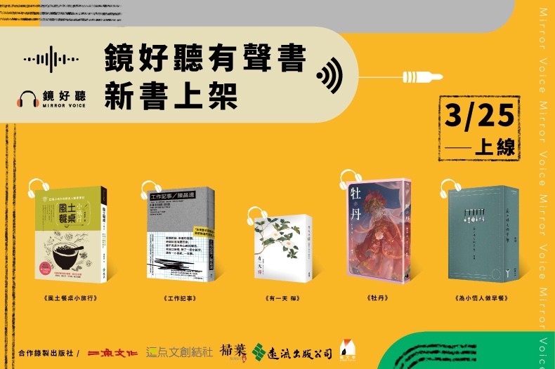 先前拜訪某出版社,他們提到有聲書「是不是只能錄小說」「好像只有文學類」。當然不是,聽聽我們三月上架的5本新書,包括具備地方創生精神,由洪震宇撰述的《風土餐桌小旅行》、透過「公案」認識禪學,作家楊惠南的《有一天,禪》。另外也錄製了具代表性的各類文學作品,如焦桐假借美食之名,實則父愛爆發的《為小情人做早餐》(下部‧娃娃書)、勇奪2020金典獎、蓓蕾獎的陳昌遠詩集《工作記事》、批踢踢Marvel板話題作家陳乃雄的作品,彷彿「日治時期暮光之城」的吸血鬼小說《牡丹》。