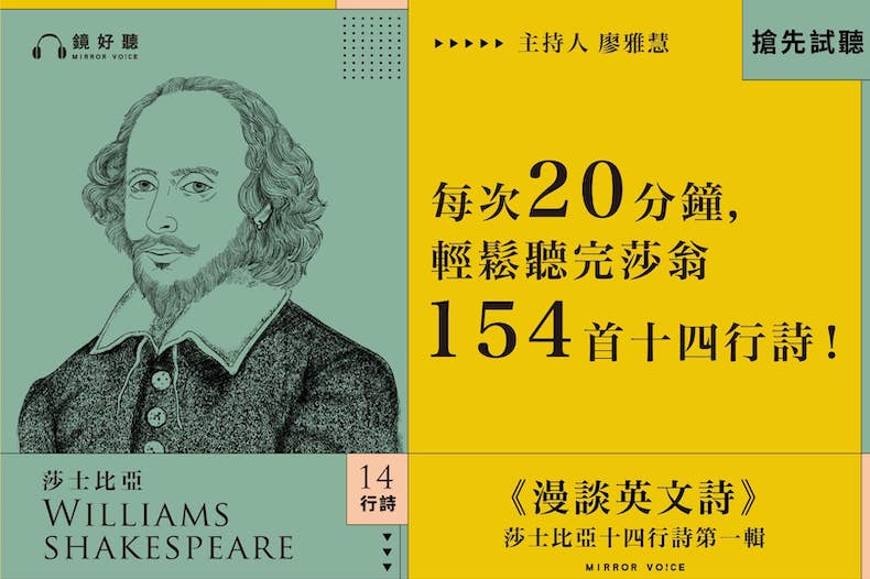 鏡好聽攜手教授英美文學近20年的廖雅慧老師,一同製作《漫談英文詩——莎士比亞十四行詩》系列聲音內容,將首度完整講授莎翁154首十四行詩。而於五月上架的《漫談英文詩——莎士比亞十四行詩第一輯》,已於7月21日完播,本輯從莎士比亞十四行詩第一首談至第十九首,主題在稱頌一位美少男的美,而莎翁的最高讚美,就是勸他「多生育」!